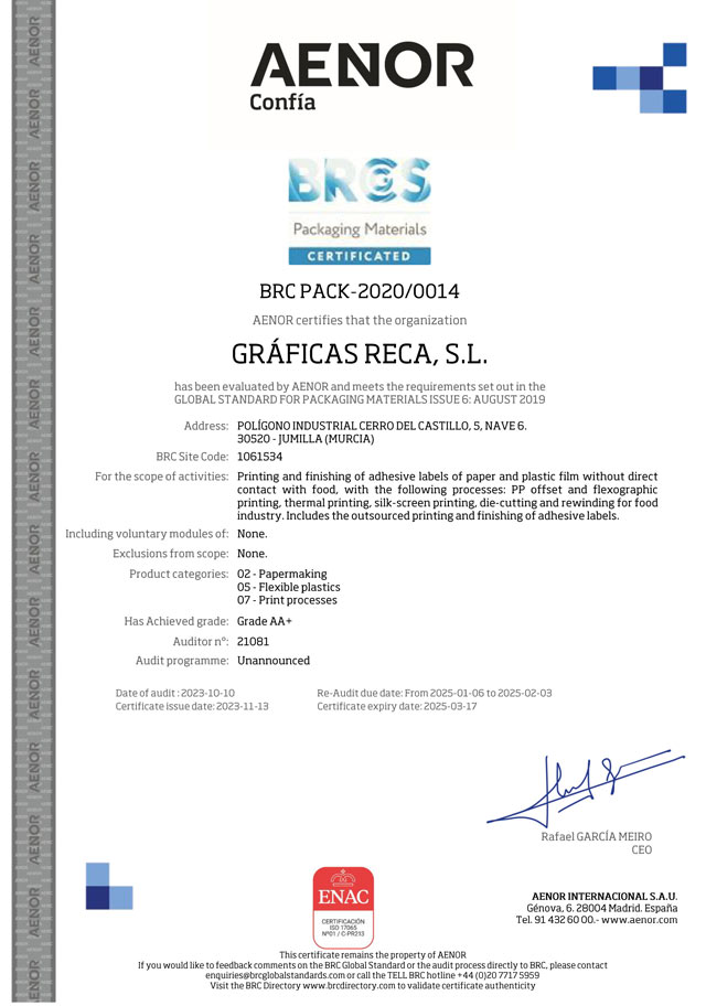 Siamo felici di annunciare che la nostra impresa spagnola Gráficas Reca ha ottenuto il massimo punteggio BRC, AA+, nel suo recente audit.